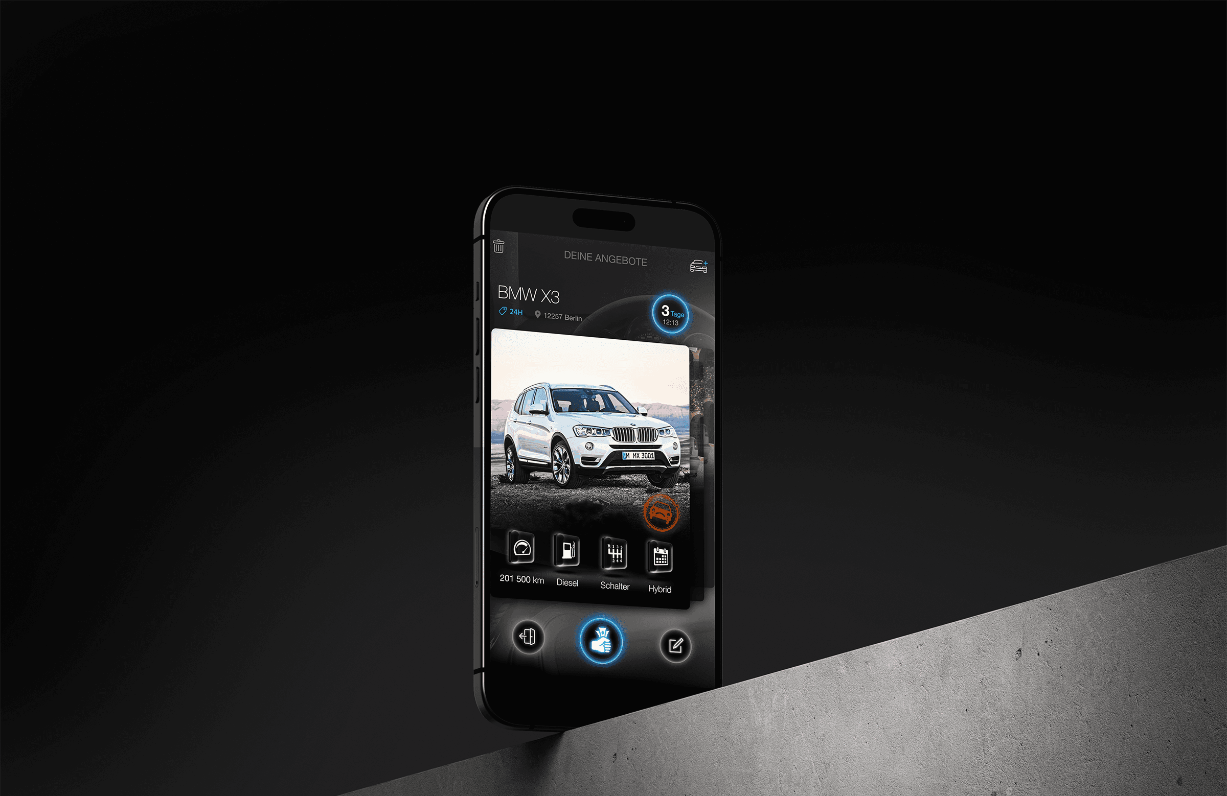 We select the car's equipment using glowing balls, and the auction duration on the timeline. In the second view, the car transforms into money, further encouraging the user to bid. This is a psychological trick.
