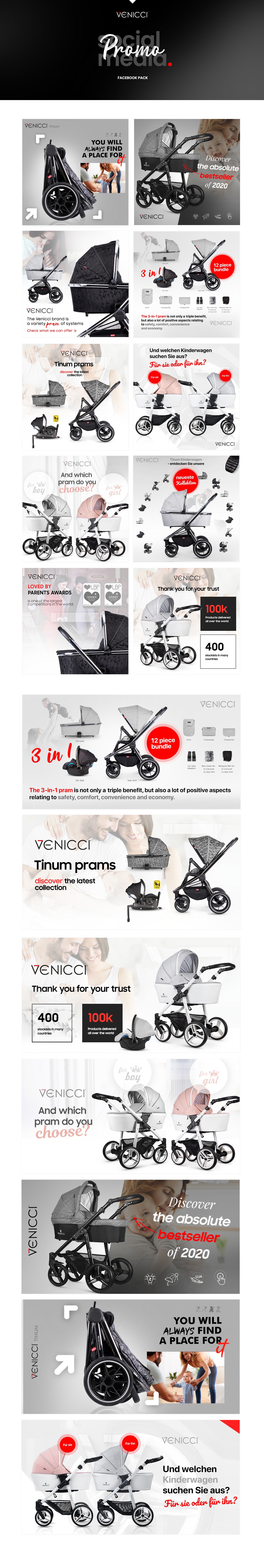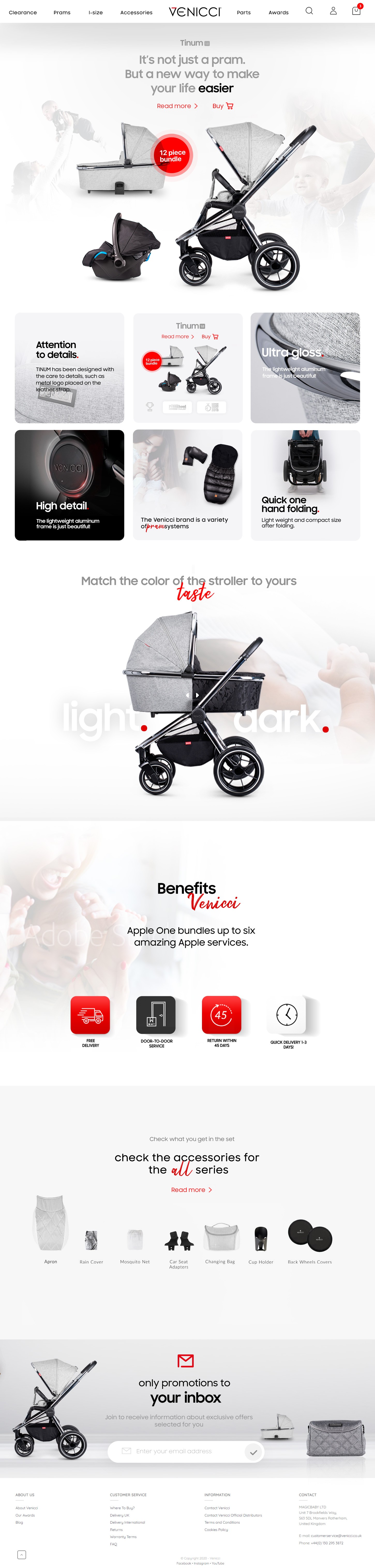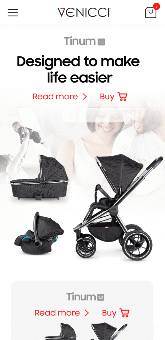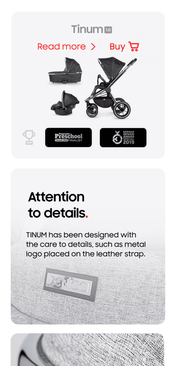 Presenting an attractive offer of children's strollers from the Tinum series in order to highlight the product's innovations and motivate the user to purchase the product